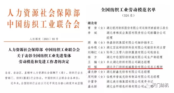 為表彰獎(jiǎng)勵(lì)一批為國(guó)家紡織工業(yè)做出突出貢獻(xiàn)的先進(jìn)集體和個(gè)人,近日,人力資源社會(huì)保障部、中國(guó)紡織工業(yè)聯(lián)合會(huì)決定(人社部發(fā)【2021】93號(hào)文),表彰全國(guó)紡織工業(yè)先進(jìn)集體、勞動(dòng)模范和先進(jìn)工作者,天門紡機(jī)總工程師鄭強(qiáng)被授予“全國(guó)紡織工業(yè)勞動(dòng)模范”榮譽(yù)稱號(hào)。