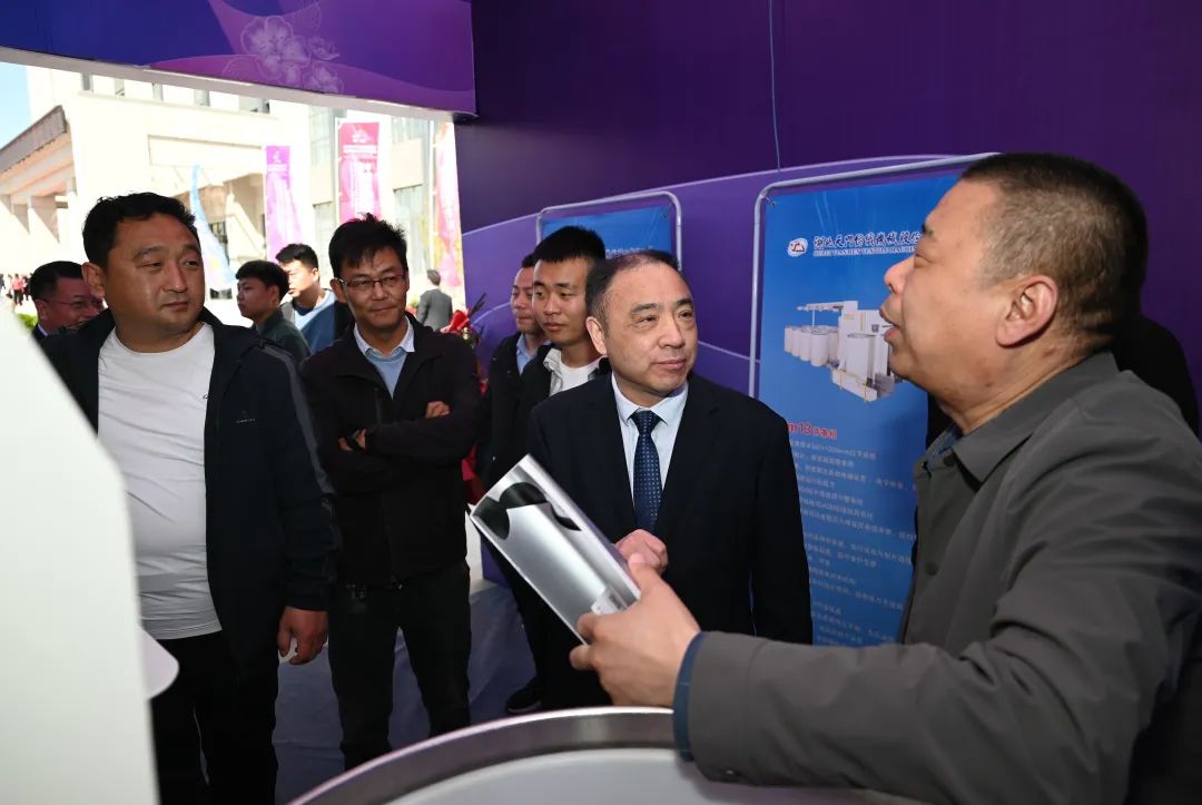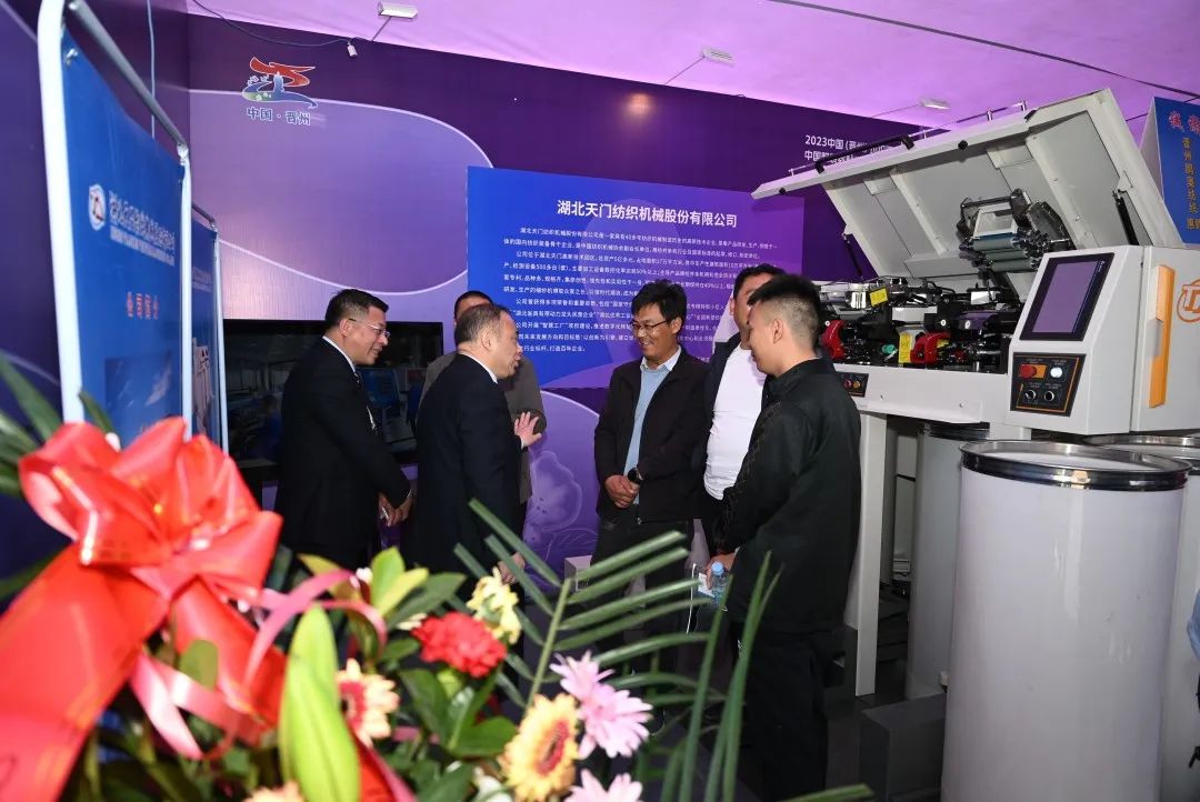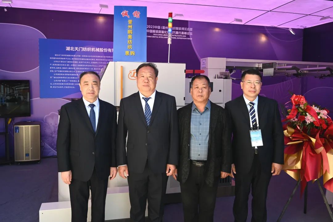 天門紡機總經(jīng)理焦倫進向蒞臨公司展位的晉州市長王林(右2)、中國服裝協(xié)會常務副會長楊金純(右1)、晉州市紡織服裝行業(yè)協(xié)會會長李永強(左1)介紹公司與晉州紡織企業(yè)合作情況