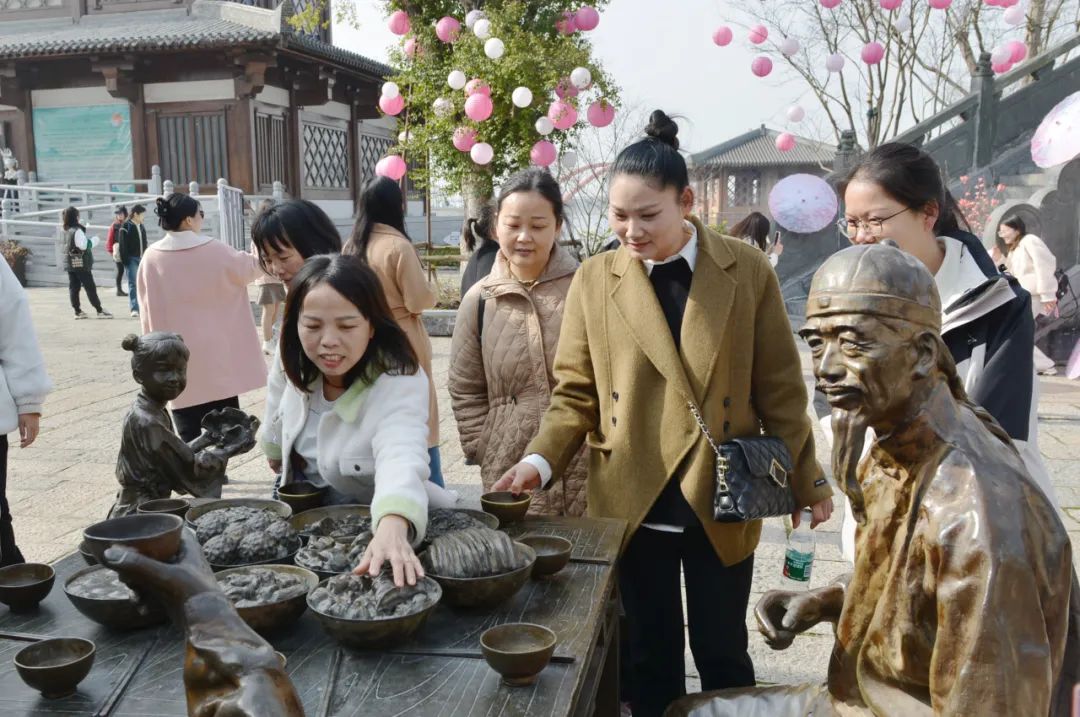 游覽過(guò)程中,女工們有的參觀小鎮(zhèn)書院,了解當(dāng)?shù)氐臍v史文化;有的在小銅人雕塑旁合影留念,定格美好時(shí)光;有的登上文昌閣遠(yuǎn)眺,感受湖光山色。