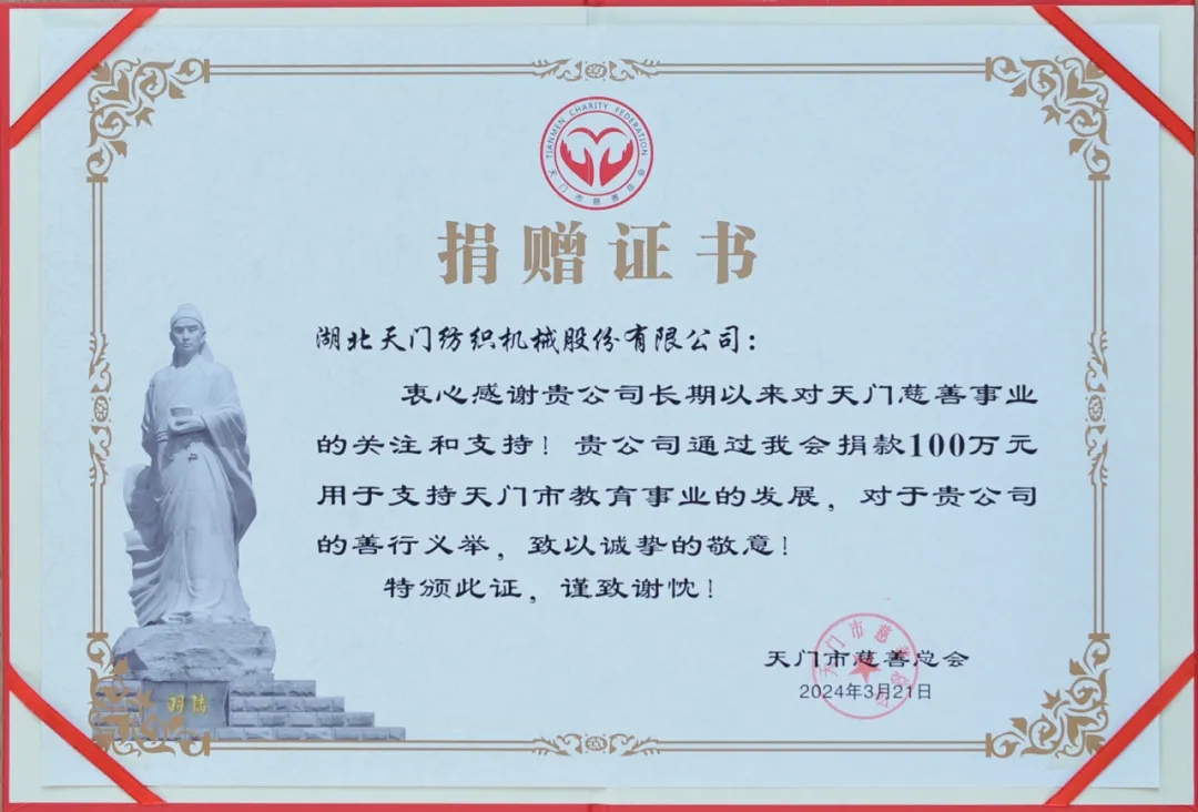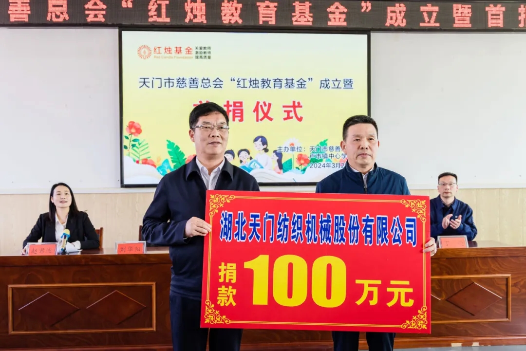 2024年3月21日,天門紡機(jī)董事長沈方勇出席在天門市盧市鎮(zhèn)盧家口中學(xué)舉行的天門慈善總會(huì)“紅燭教育基金”成立暨首捐儀式,同天門市慈善總會(huì)、教育局三方簽訂了《天門市慈善總會(huì)“紅燭教育基金”協(xié)議書》,并現(xiàn)場(chǎng)捐贈(zèng)100萬元,用于獎(jiǎng)勵(lì)盧市鎮(zhèn)優(yōu)秀教師和幫扶困難教師等公益活動(dòng),助力盧市鎮(zhèn)教育高質(zhì)量發(fā)展。天門市人民政府副市長古玉麗,天門市民政局局長、市慈善總會(huì)會(huì)長謝金才,天門市教育局局長劉華陽,天門市慈善總會(huì)秘書長李貴清,盧市鎮(zhèn)宣傳統(tǒng)戰(zhàn)委員劉恒超以及盧市鎮(zhèn)部分教師代表等參加首捐儀式。盧市鎮(zhèn)黨委書記趙君波主持儀式。